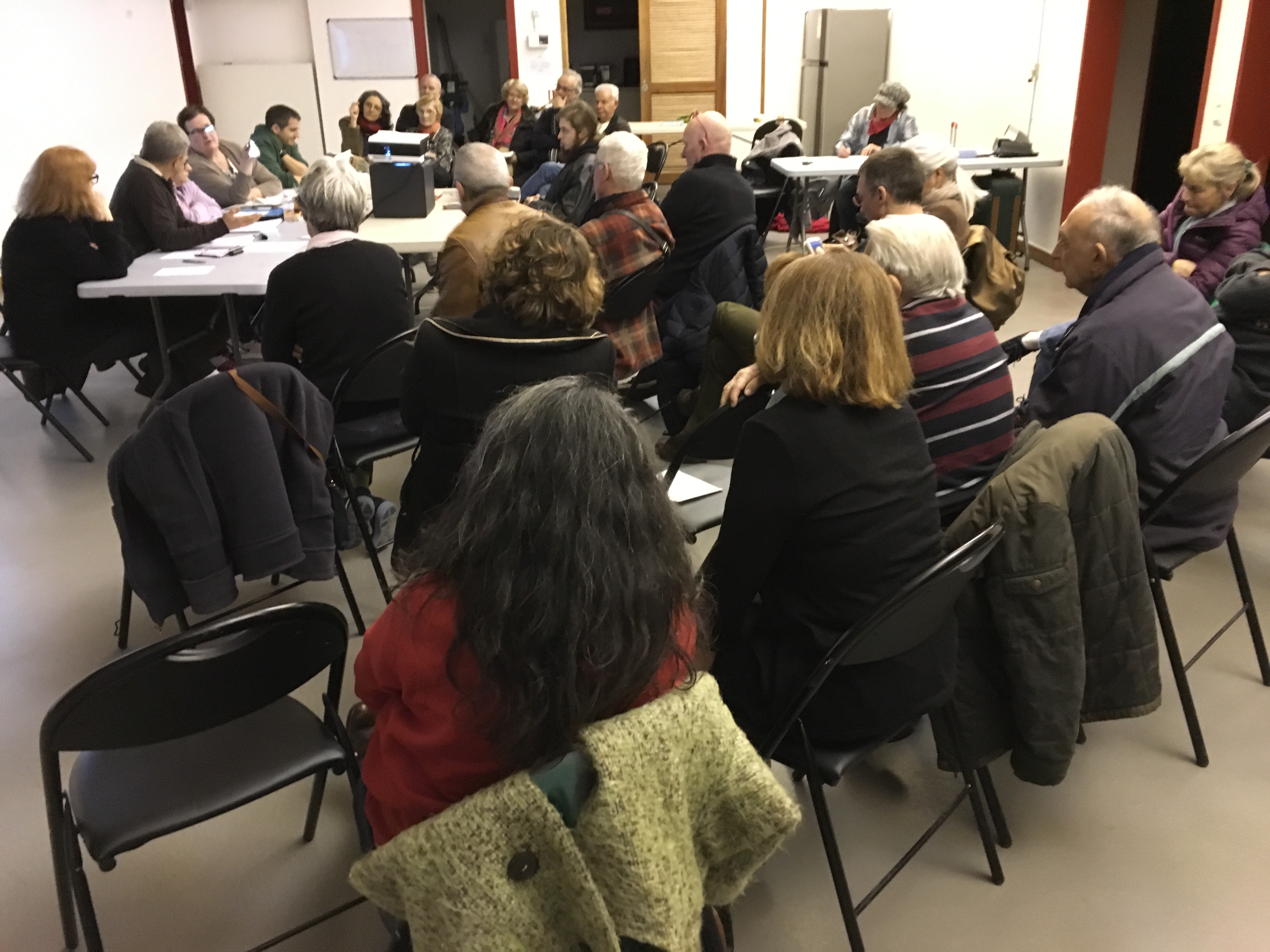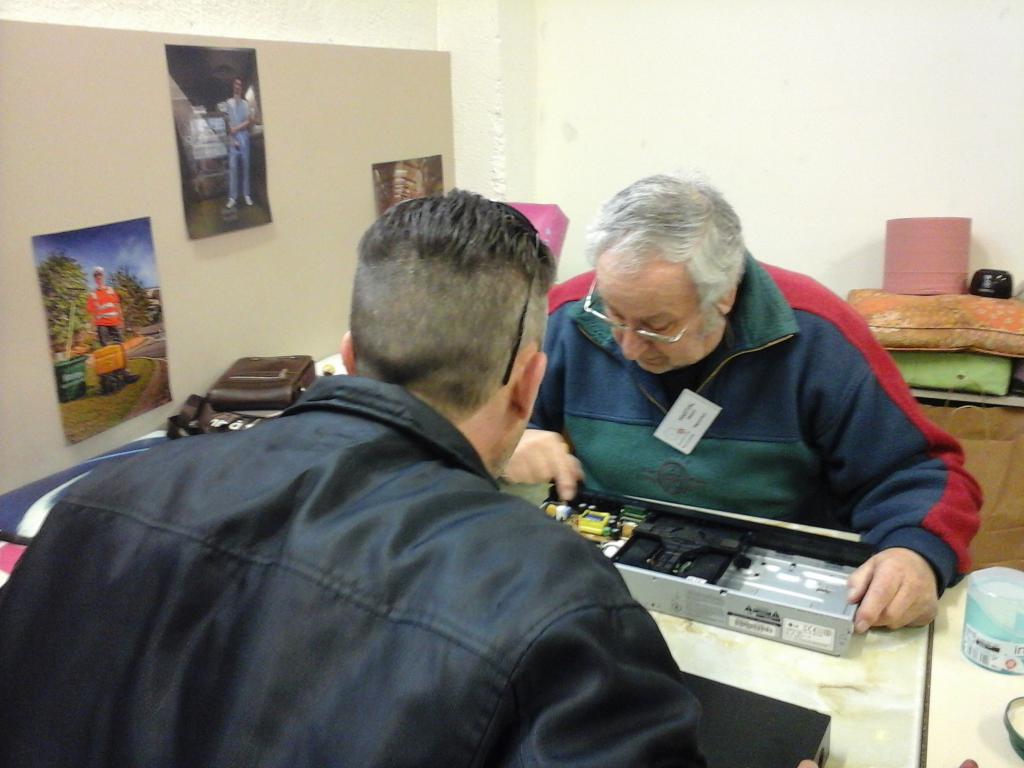 Atelier du 10 février 2018 : nouvelle disposition plus fonctionnelle des tables de travail pour un atelier plus confortable pour les réparateurs et plus aéré pour les visiteurs avec des remerciements à TETRIS qui y a bien contribué.