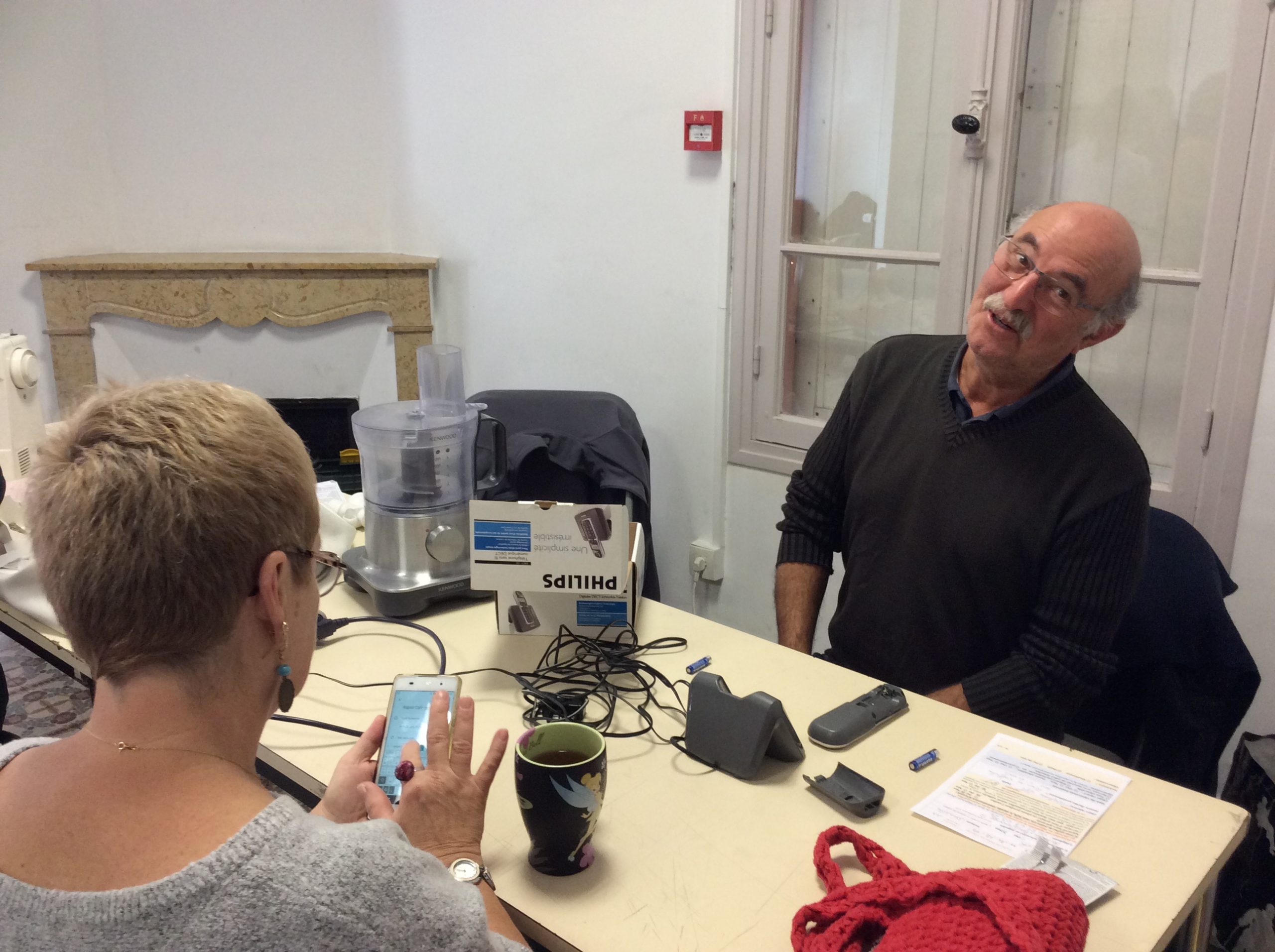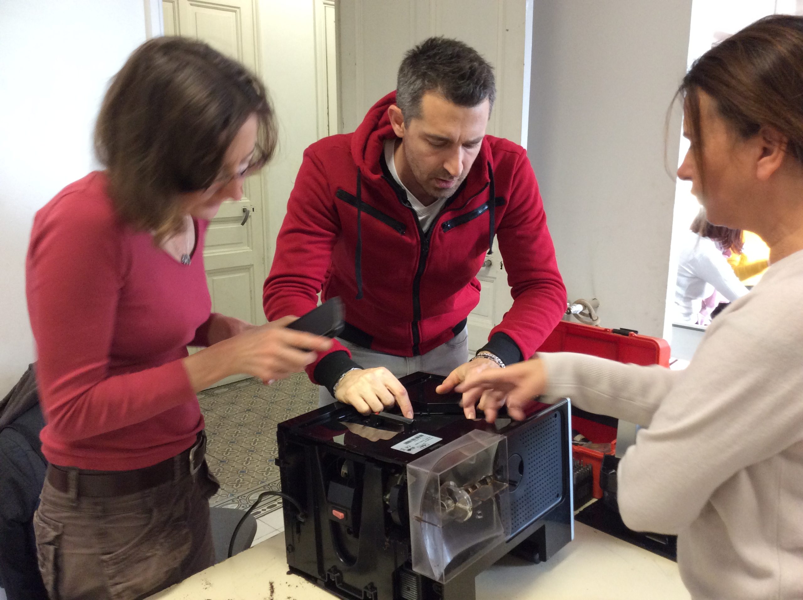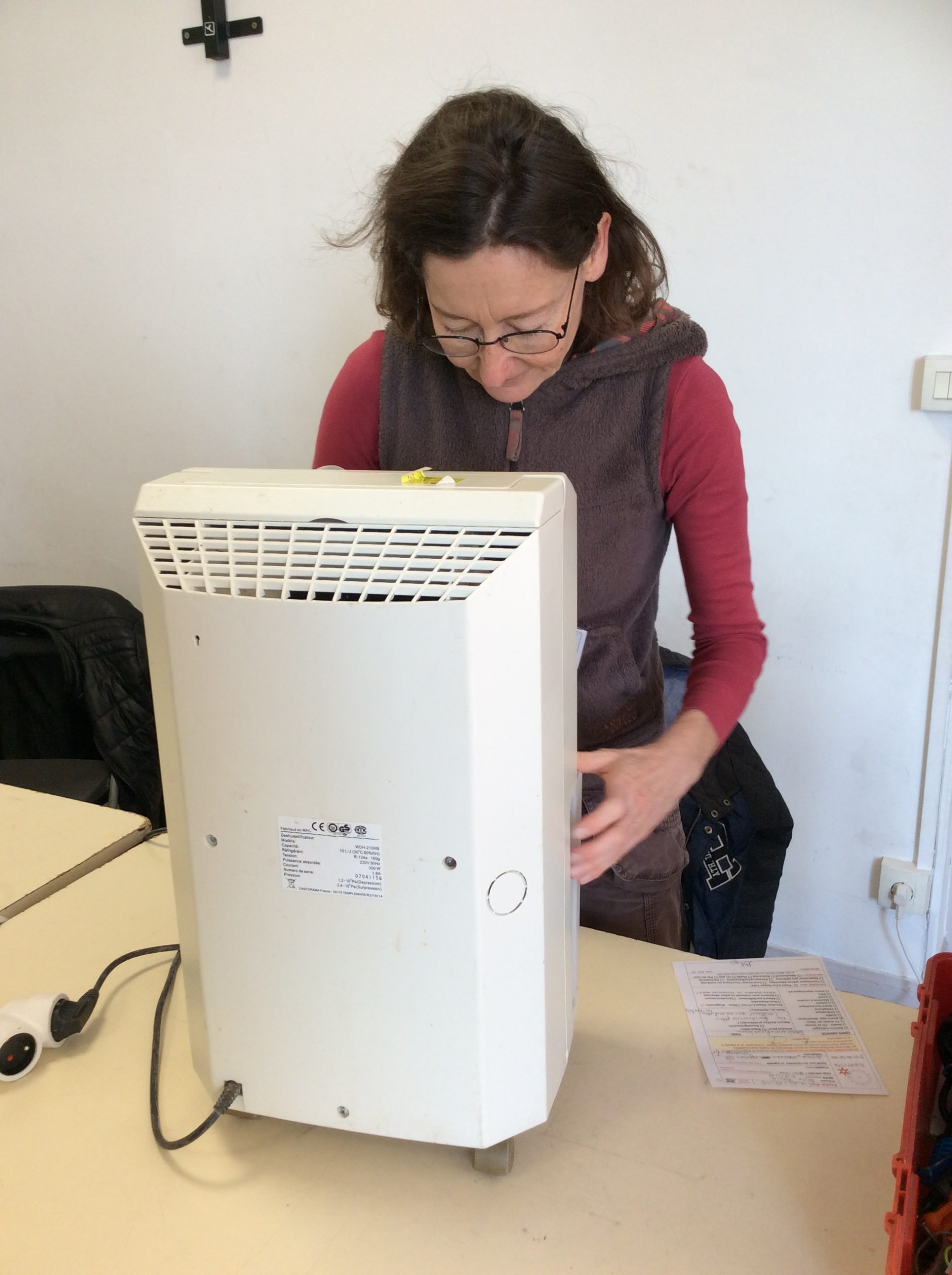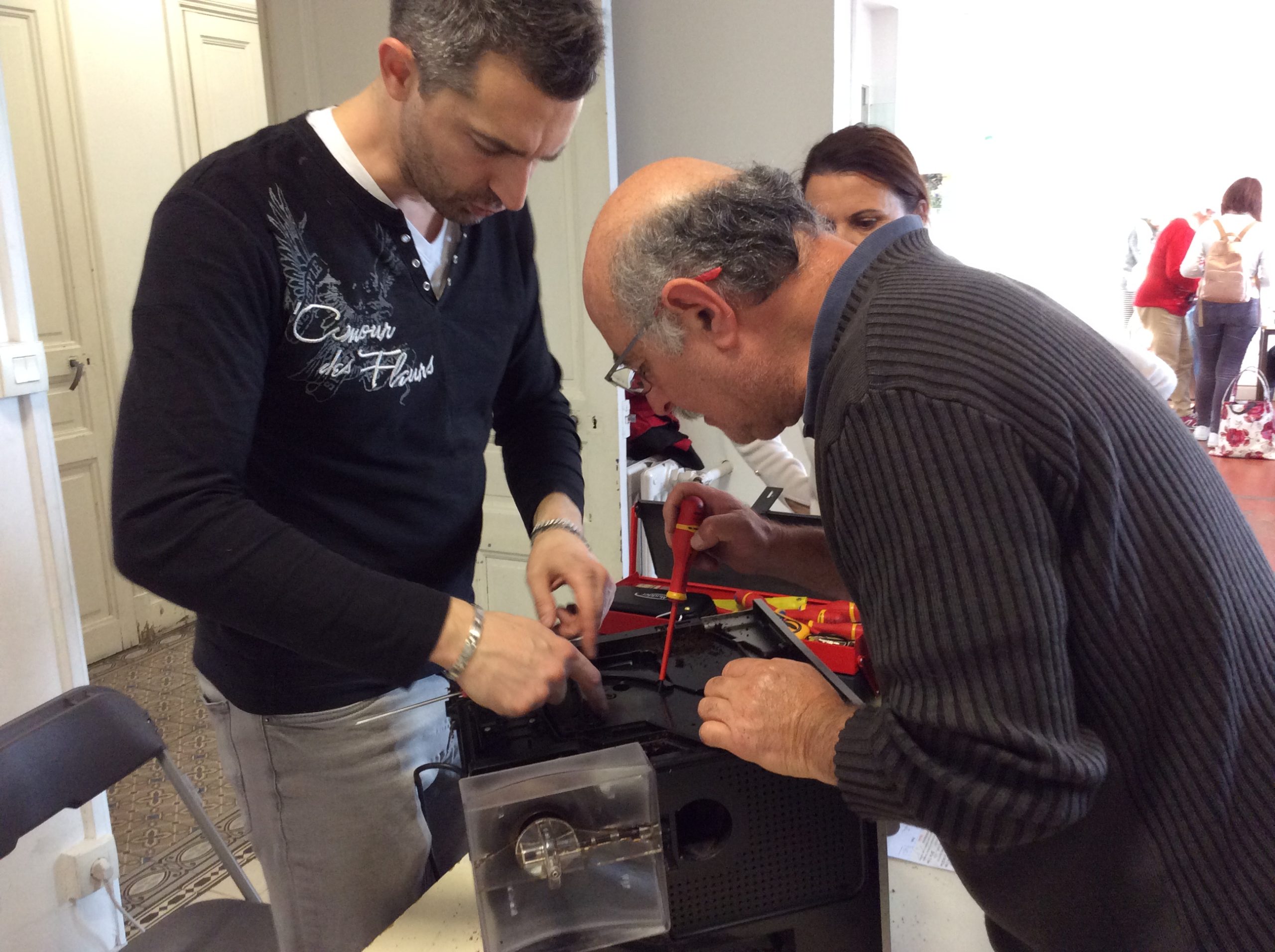 Mathilde, notre Réparatrice avec Claude, malheureusement a du nous quitter rapidement car elle ne se sentait pas très bien. Néanmoins, elle a toute de même eu de le temps de remettre en fonctionnement un déshumidificateur et de se pencher avec Olivier sur la machine à café. Nous espérons qu’avec une bonne nuit et du repos elle se sent mieux.