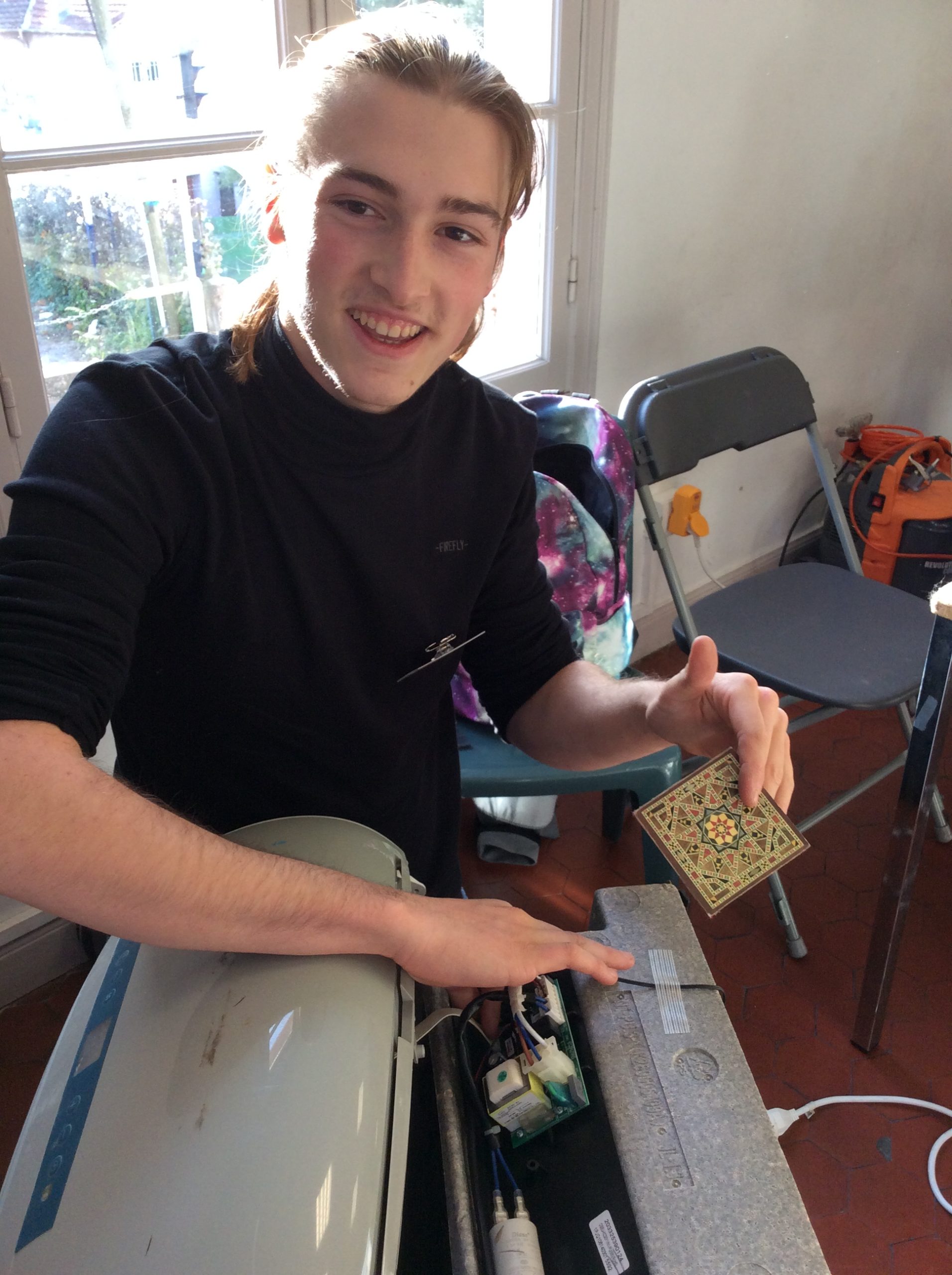 Elliot, notre benjamin, qui a brillamment remis en route l’objet le plus lourd de notre atelier. Après ouverture et extraction du sous verre qui s’était étrangement glissé dans ce climatiseur, ce dernier s’est remis à fonctionner sans problème! Il m’a semblé que la panne de l’imprimante qui a suivi a donné plus de fil à retordre…