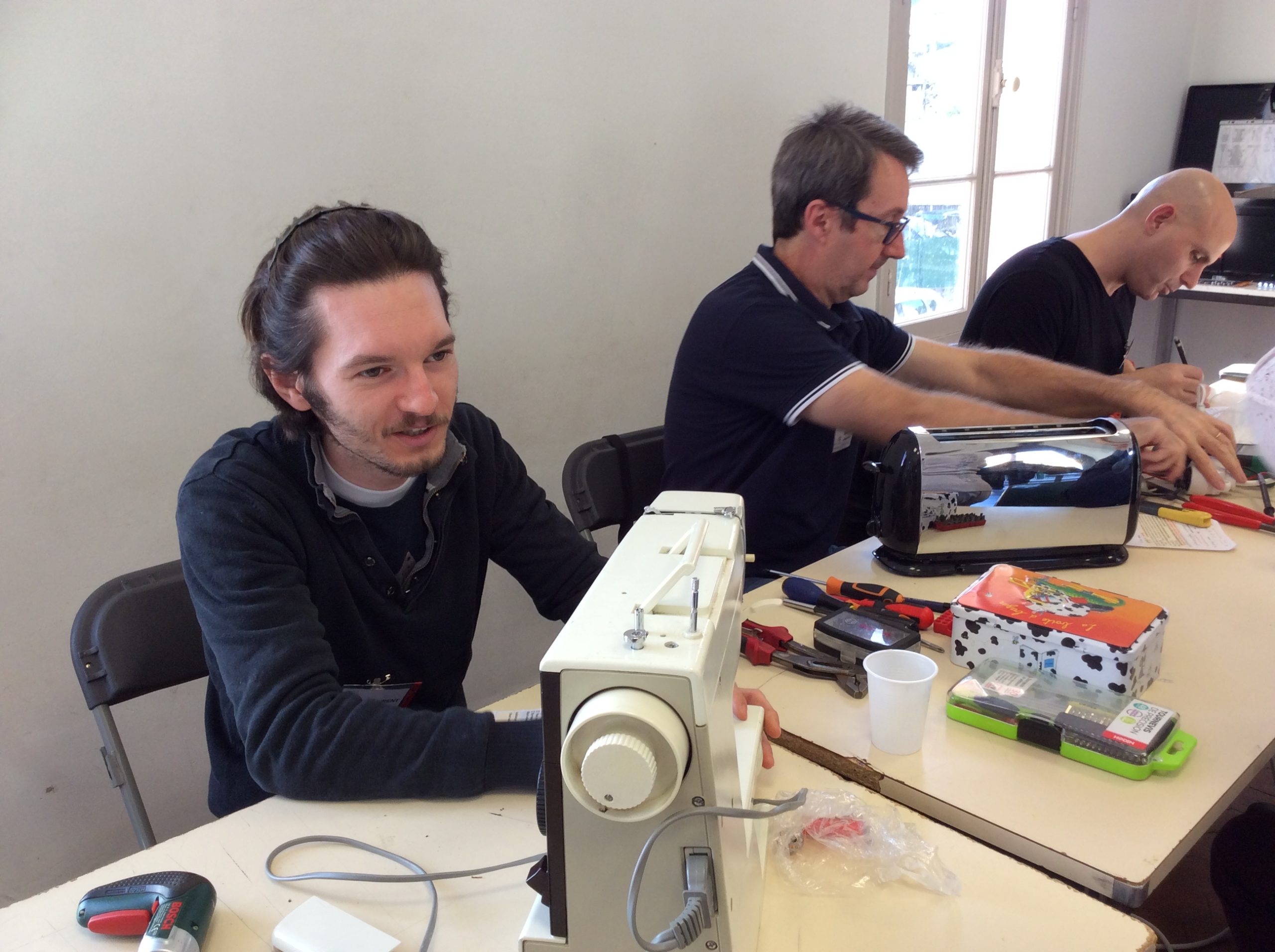 Une mention spéciale à Soleiman, le président du Repair Café Cannes, venu ce samedi pour un petit coucou. Un réparateur ne se déplaçant pas sans sa caisse à outil, il s’est mis au travail… téléphone, machine à coudre, et divers objets sont passés entre ses doigts compétents .. Et il est reparti avec une future bénévole pour le Repair café de Cannes! Quel homme habile…