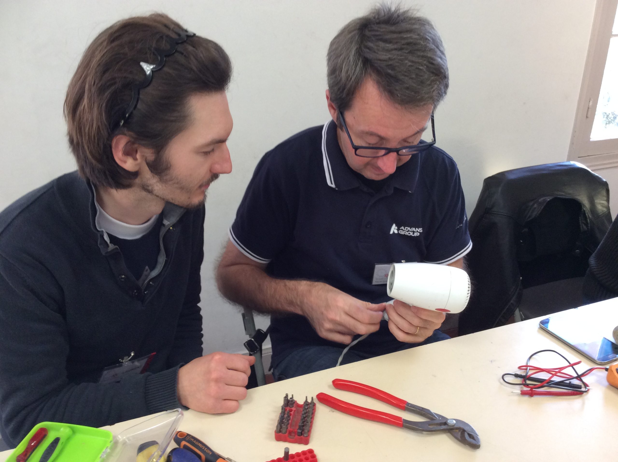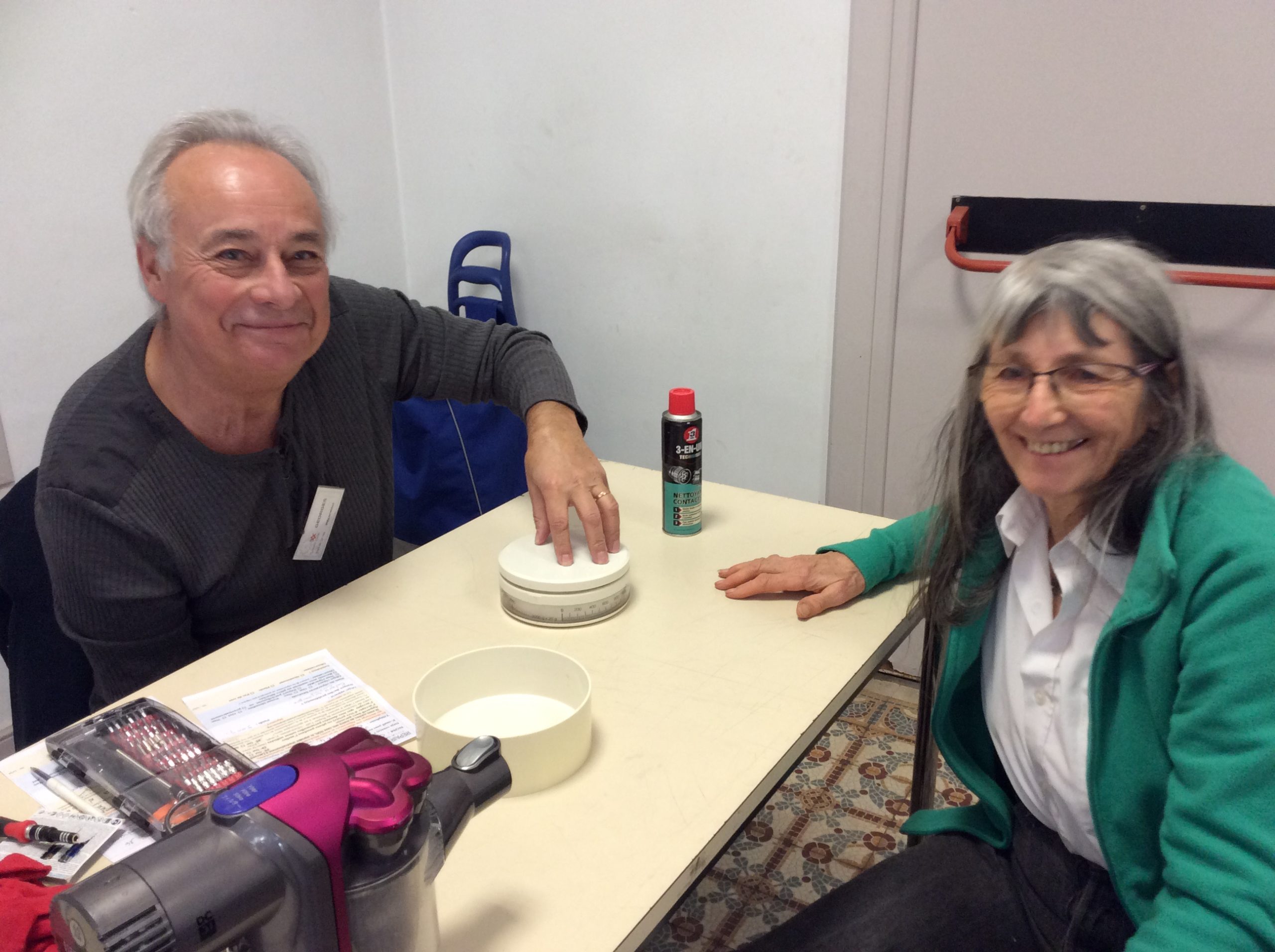 Christophe a gagné le prix du jour… en faisant « sauter les plombs », ce qui habituellement est réservé à Martial… Il a pris sous son aile réparatrice Laurent, réparateur débutant, qui a suivi attentivement ce que Christophe partageait avec pédagogie au sujet des objets arrivant sur sa table: magnétoscope réparé grâce au fluide de ses doigts magiques, grille-pain, sèche-cheveux.Il est reparti déçu malgré tout, car pas d’aspirateur lors de cet atelier…