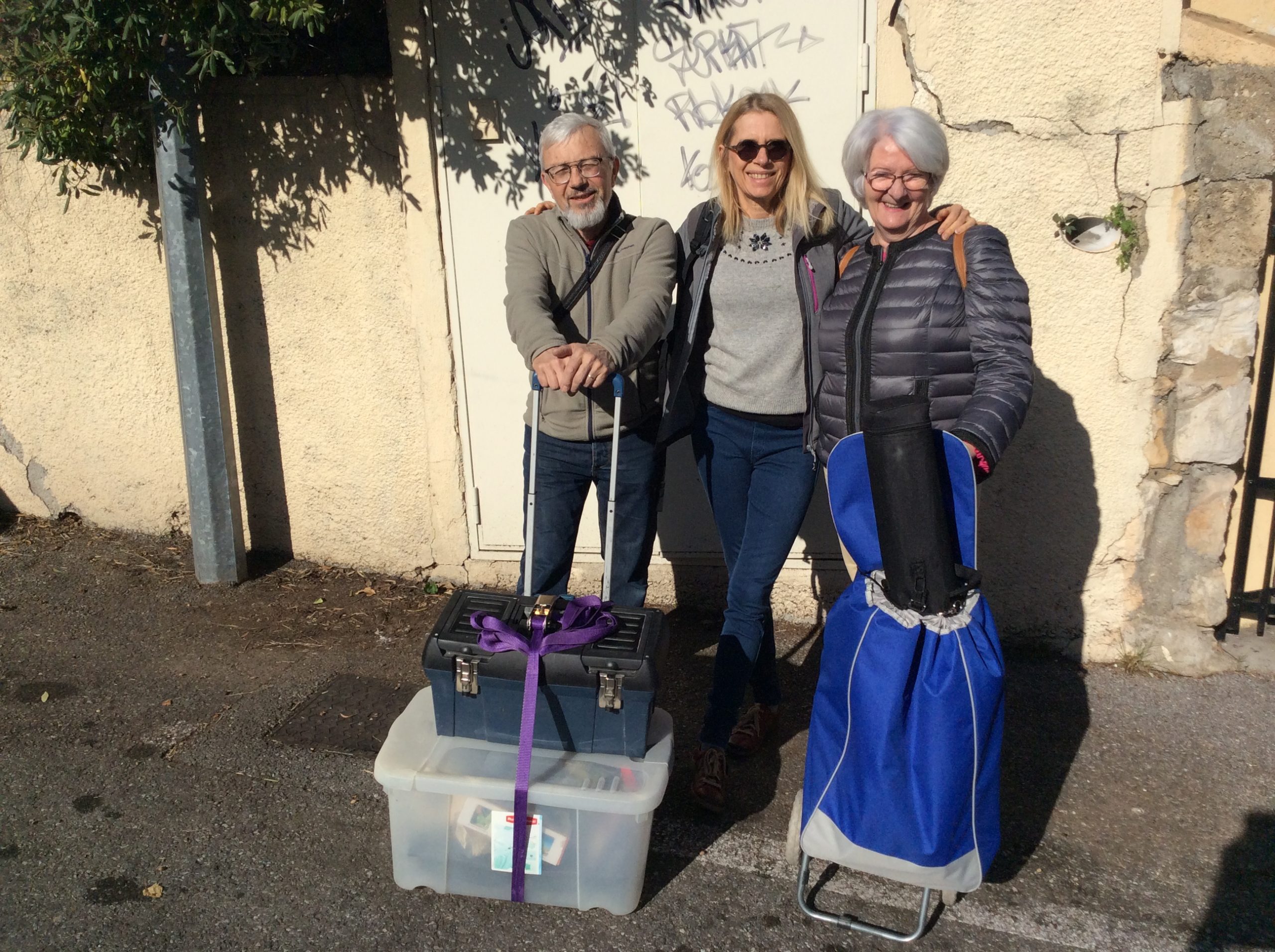 C’était hier ! Tandis que quatre bénévoles se rendaient à pieds pour certain.e.s (style les Pieds nickelés comme vous pouvez le constater) place aux Herbes, les deux autres profitaient du charme des sens uniques et petites rues grassoisses avant de rejoindre Adèle, la directrice le l’association.