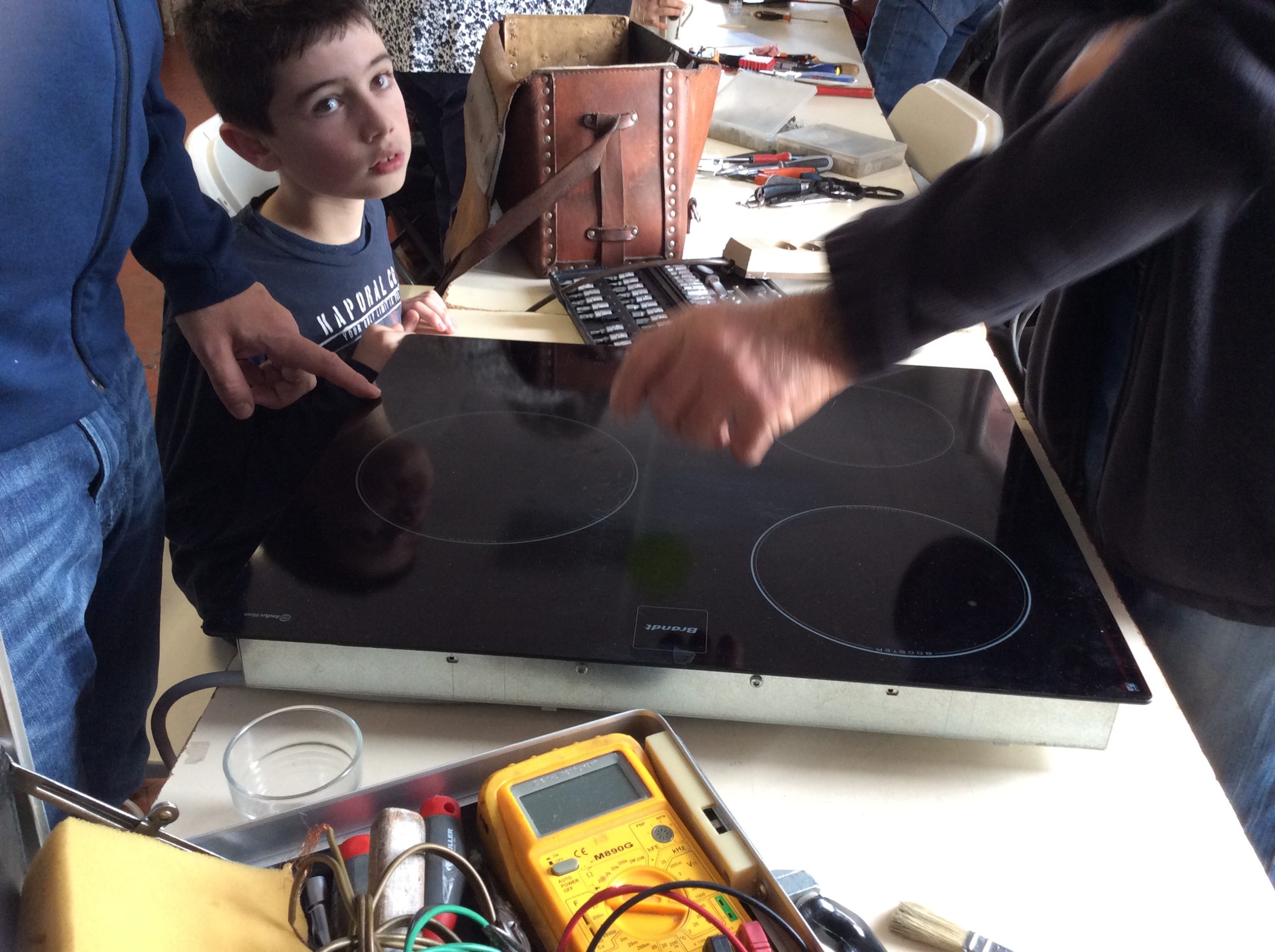 Notre mini bénévole, Marceau, ne comprenant pas vraiment comment fonctionnait l’induction, Christophe (responsable formation) lui a fait un petit cours improvisé qui lui a permis de mieux cerner de type de cuisson.  Et oui, au Repair Café,  nous réparons, expliquons, partageons. Telle est notre philosophie..