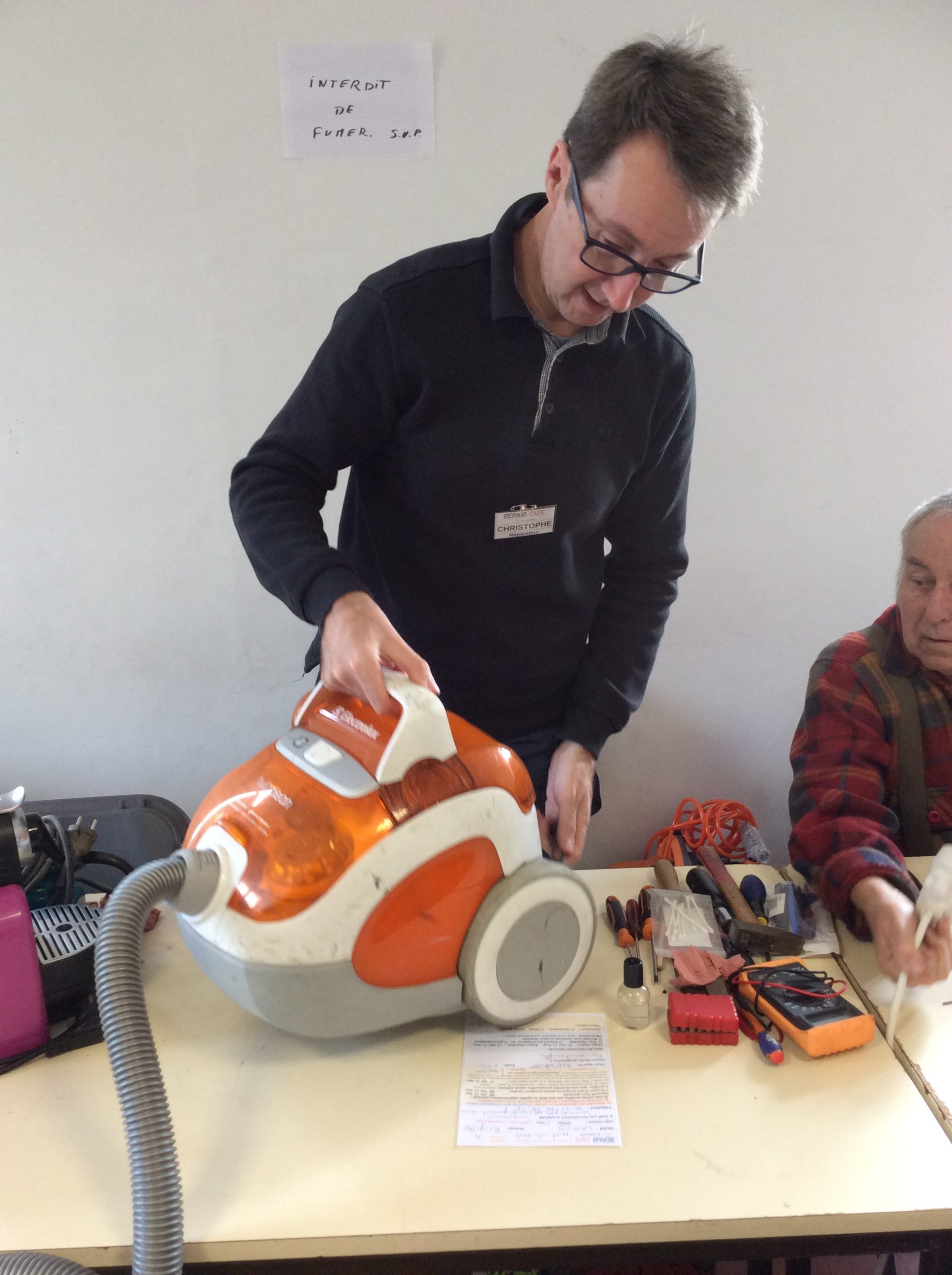 Mais non… au Repair Café, nous aimons la fantaisie, et nous en avons parfois quelques unes, comme vous le montre Jean Marc qui ce jour là avait décidé de s’étiqueter à l’envers.