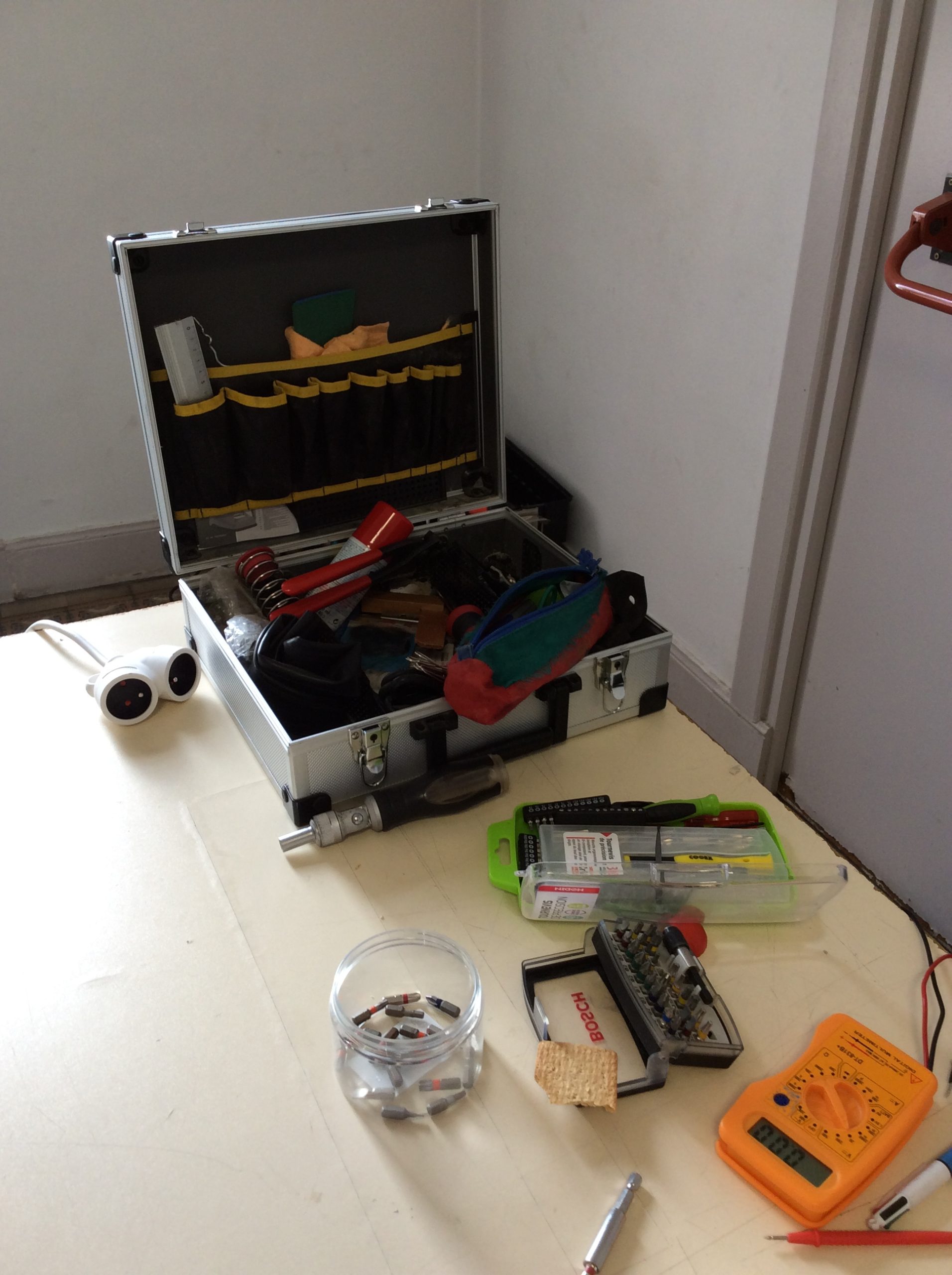 Les objets traditionnels sont venus nous rendre visite : modèle de cafetière inédit dans notre atelier jusque là (tellement inédit que nous n’avions pas la bonne tête de vis pour l’ouvrir), aspirateur sur lequel Christophe s’est empressé de se jeter puisque c’est c’est son objet favori après la cafetière, sans compter les centrales vapeurs, machines à coudre, grilles pain et .. une plaque à induction.