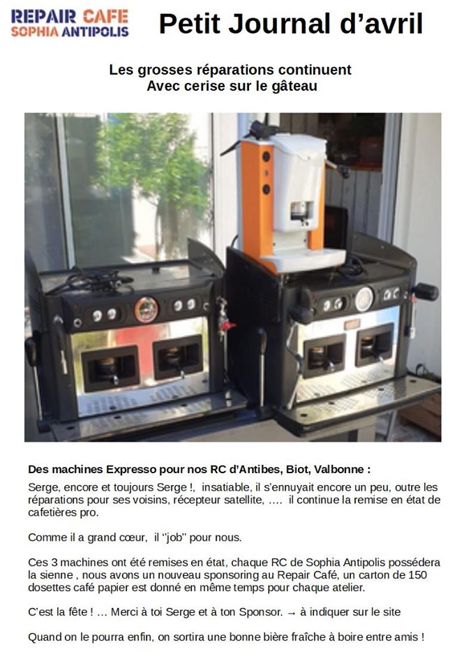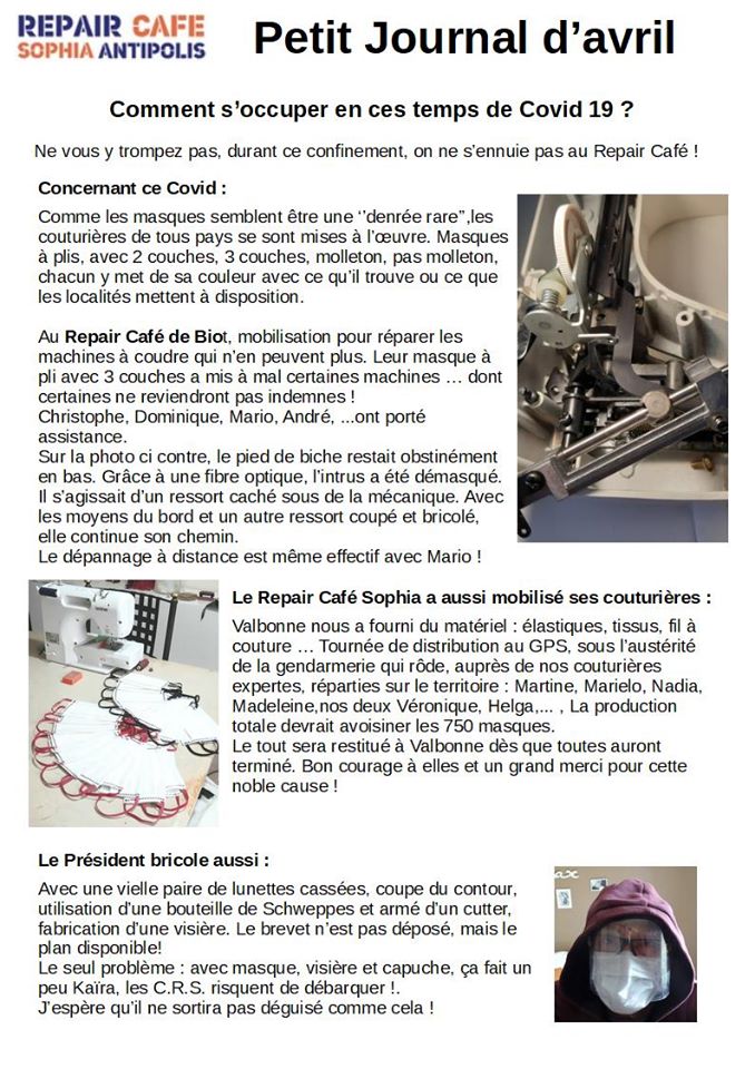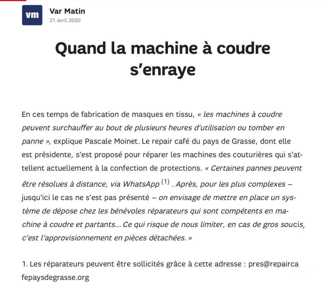 Les Repair Cafés de Grasse et Sophia Antipolis (Biot Valbonne Antibes) ne se sont pas endormis pendant ce confinement . Leurs bénévoles ont continué discrètement mais sûrement à réparer, bricoler, donner de bons conseils.. et leurs efforts ont été reconnus : preuve en est, l’article de Nice Matin paru le 22 avril dans lequel André Vianès président des Repair Cafés Sophia Antipolis, et moi même, présidente du Repair Café Pays de Grasse avons donné nos sites de dépannage favoris, ainsi que des petits « trucs » de base que chacun et chacune peut mettre en oeuvre lorsqu’il ou elle se retrouve seul.e face à l’intruse que devient une bouilloire électrique récalcitrante par exemple. Suivez donc ce lien afin de lire l’article dans son intégralité.