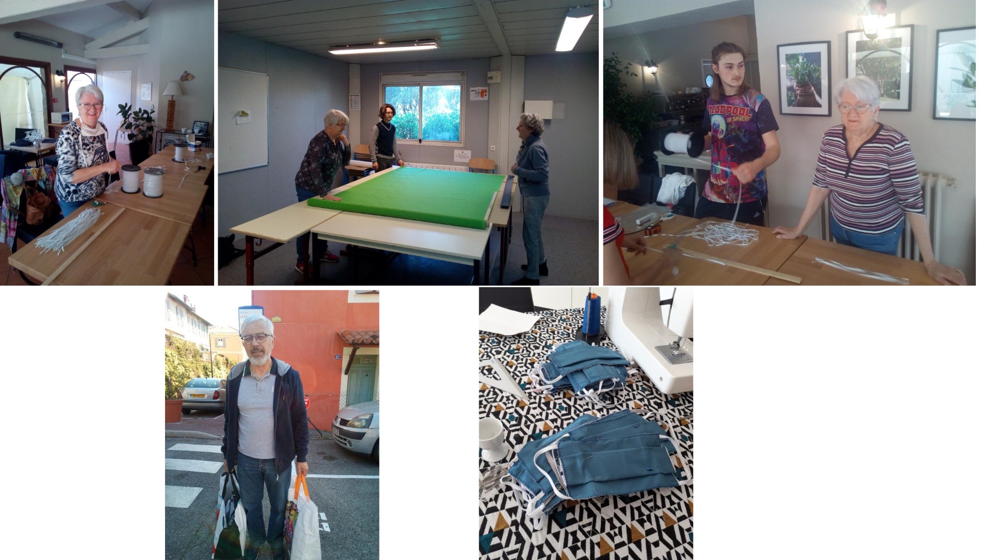 Ça bourdonne de tous côtés tandis que Georges, Nicole, Laurence, Elliot et Laurent, bénévoles grassois, passent leurs journées à couper élastiques et tissus qui vont être envoyés aux petites mains à travers la ville par d’autres bénévoles. Nous manquons d’une ou une bénévole masseur.euse ou kiné afin de remettre en état de fonctionnement les dos et les épaules courbaturé.e.s par les heures penchées au dessus des tables ou des machines à coudre….