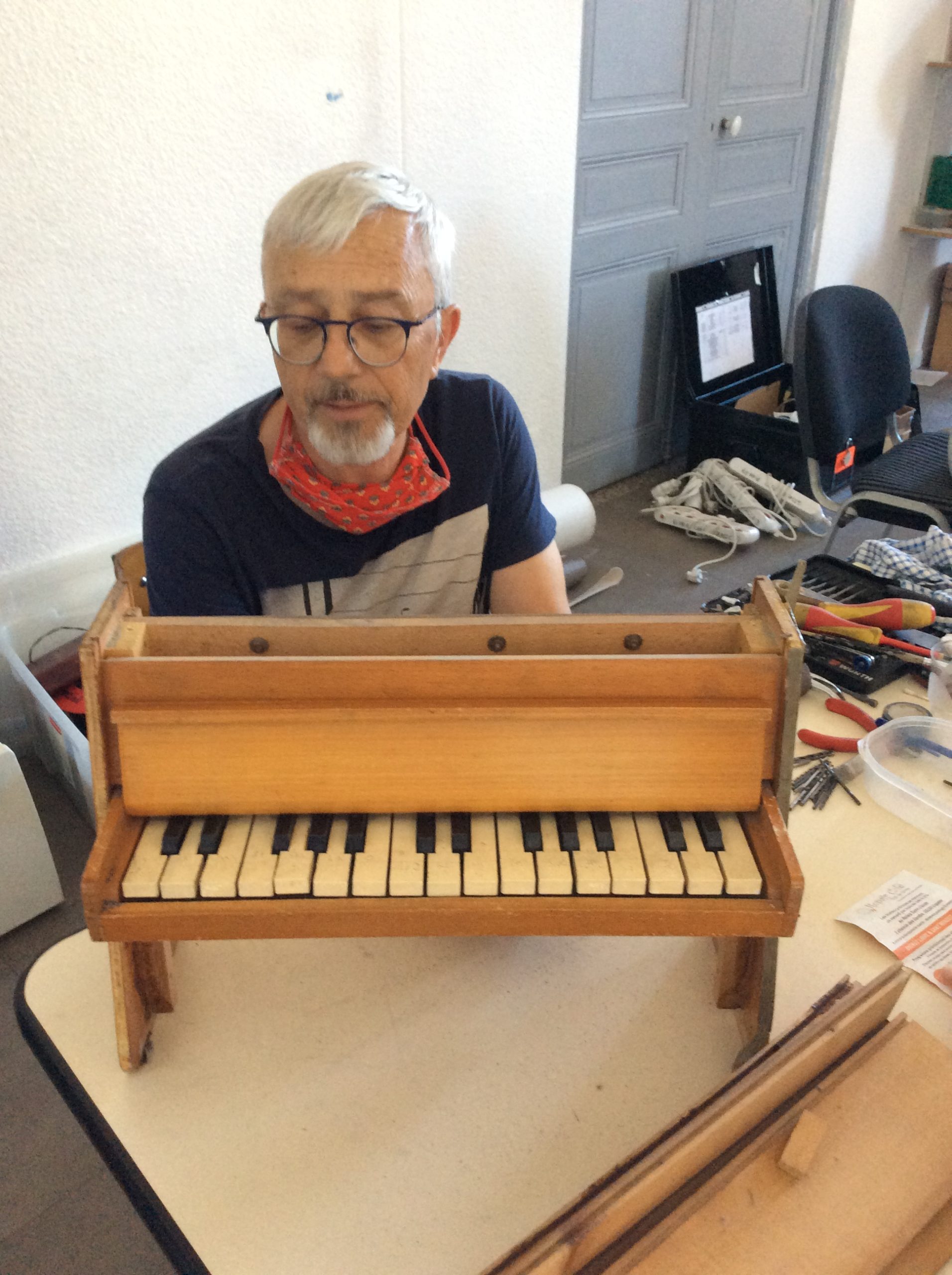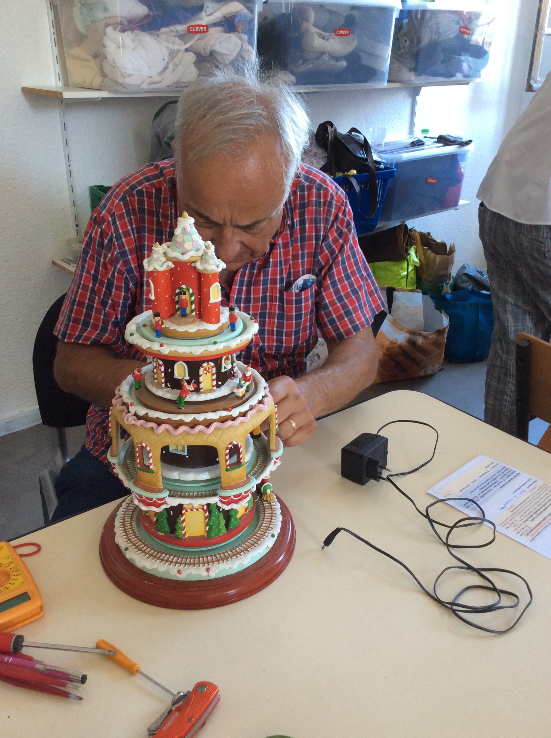 Notre trésorier, installateur technique d’atelier a plusieurs péchés mignons.. et la réparation d’imprimante en fait parti. Il a été gâté, puisque quelques unes sont passées entre ses mains cette après midi là.. Il pu aussi réparer un lecteur DVD, et a eu la chance d’avoir sur sa table de réparateur le plus mignon objet de l’après midi: une boîte à musique de Noël. Pas de saison pour s’attendrir.