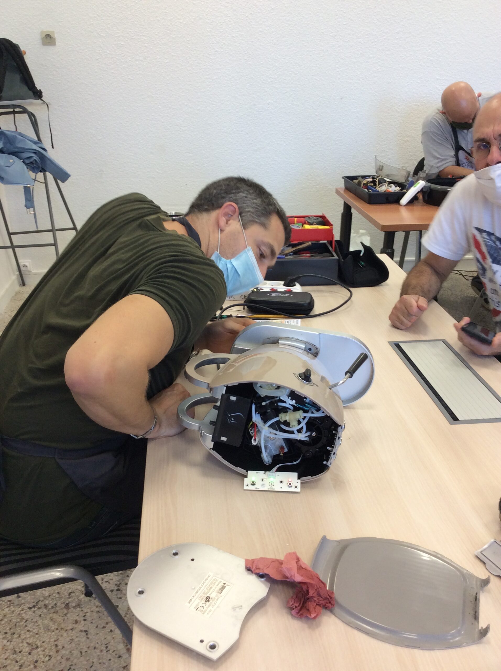 Pendant ce temps, nos réparateurs habituels (du moins ceux qui ne sont pas en vacances –Yann et Christophe-) se sont penchés sur différents objets : nous avons pu ainsi voir François perplexe devant le mode d’emploi d’un nettoyeur vapeur  (qui a fini par livrer le secret de sa panne) , Georges (toujours friand d’imprimante mais qui a eu maille à partir avec une centrale vapeur), Michel (qui tirait la langue devant une machine à coudre mais a eu plus de chance avec un hallogène).