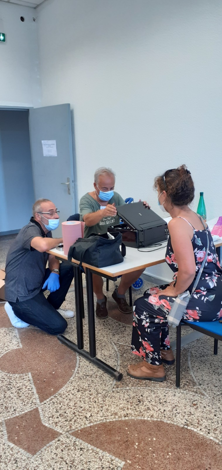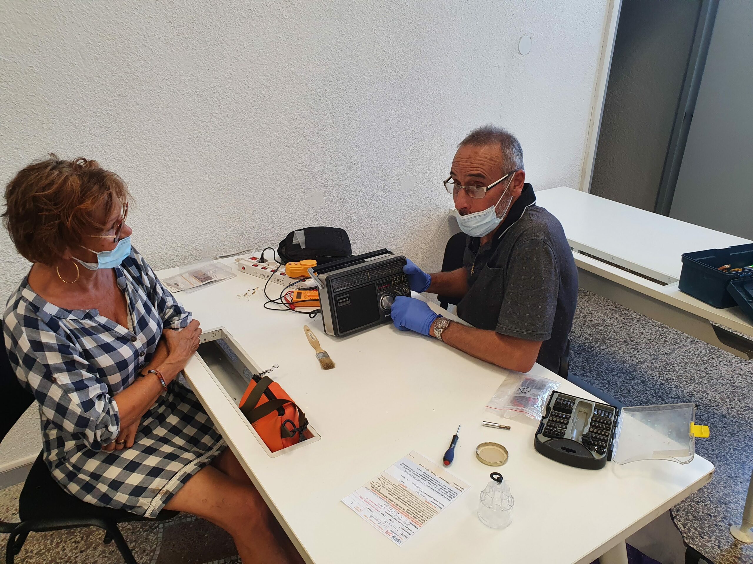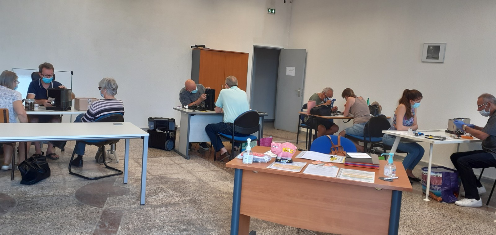 Cinq bénévoles pour vous ouvrir ce premier atelier de reprise : ce sont Nicole, Claude, Christophe, Georges et Eric qui se sont penchés sur vos appareils ce jour là.  Ces derniers avaient attendus tout l’hiver dans un placard que nous puissions réouvrir, tandis que nos réparateur.trice.s s’ennuyaient de trop peu d’activités de notre association..