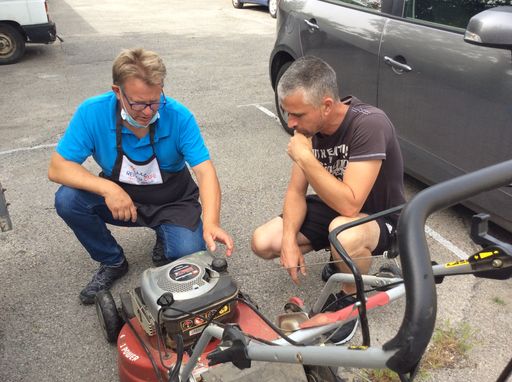 Et c’est avec six d’entre nous que les visiteur.euse.s du 19 juin ont pu faire connaissance, tandis que les habitué.e.s nous  retrouvaient. Mathilde, Martine, Michel, Pascale, Serge et Yann étaient au rendez vous . Serge ? Oui, un nouveau bénévole réparateur a rejoint nos rangs. Nous l’en remercions et l’avons accueilli chaleureusement. Nous avions prévu spécialement pour lui la réparation d’une tondeuse à gazon, car il est très performant en ce qui concerne les moteurs thermiques.