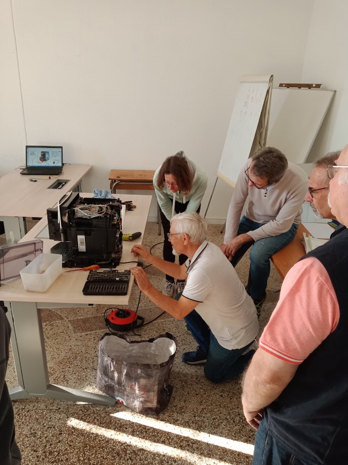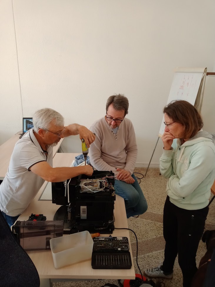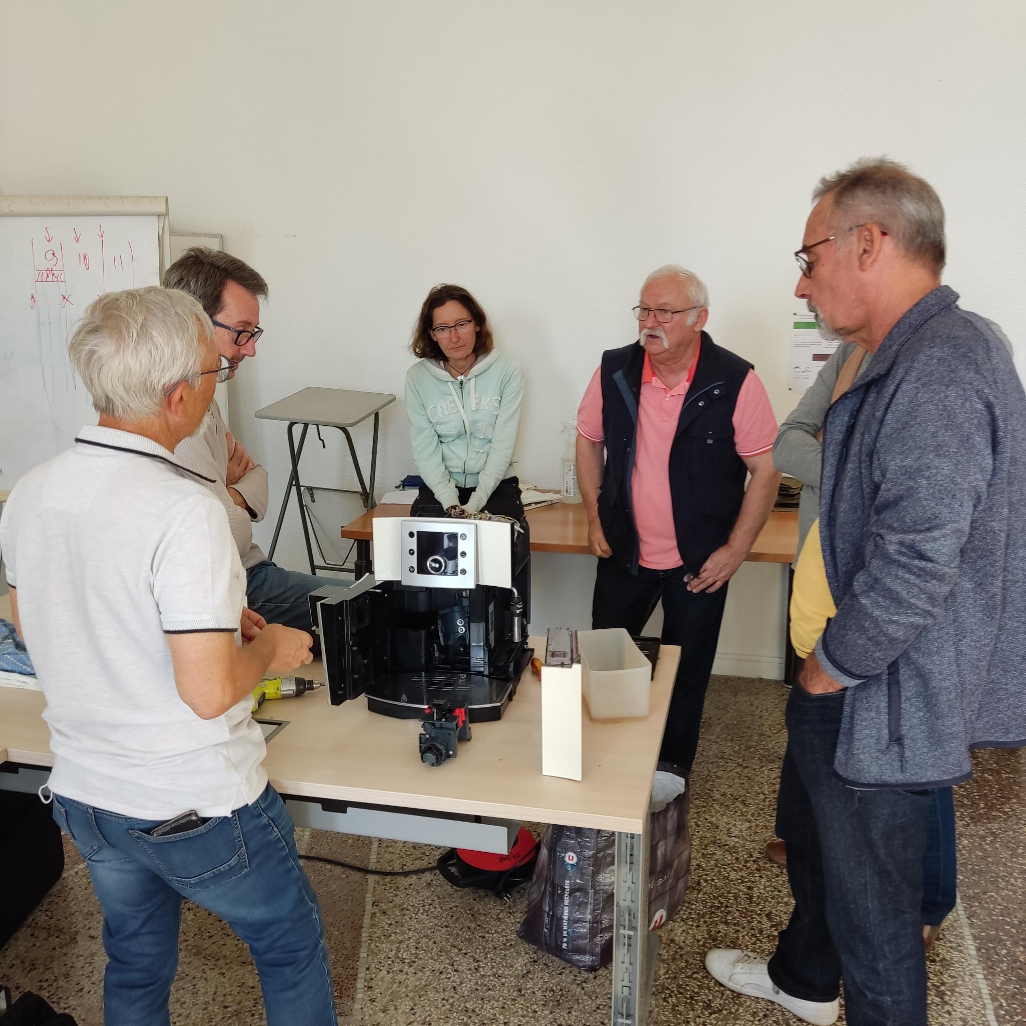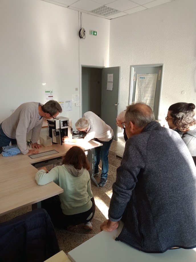 En effet, nous retrouvons de plus en plus lors de nos ateliers les machines à café qui moulent les grains et font le café. Elles sont fort complexes à réparer, et Yann, notre responsable formation, s’est fait un plaisir de partager ses compétences avec Christophe et Christophe, Claude, Georges, Jean-marc et Mathilde. Studieux pour la plupart (le prénom du cancre ne sera pas révélé, vous le verrez lorsqu’il se retrouvera seul devant une de ces machines), nul doute qu’ils et elle sauront mettre à profit leurs nouvelles compétences dès le prochain atelier, puisqu’un rendez vous est prévu pour une de ces machines le 6 novembre.