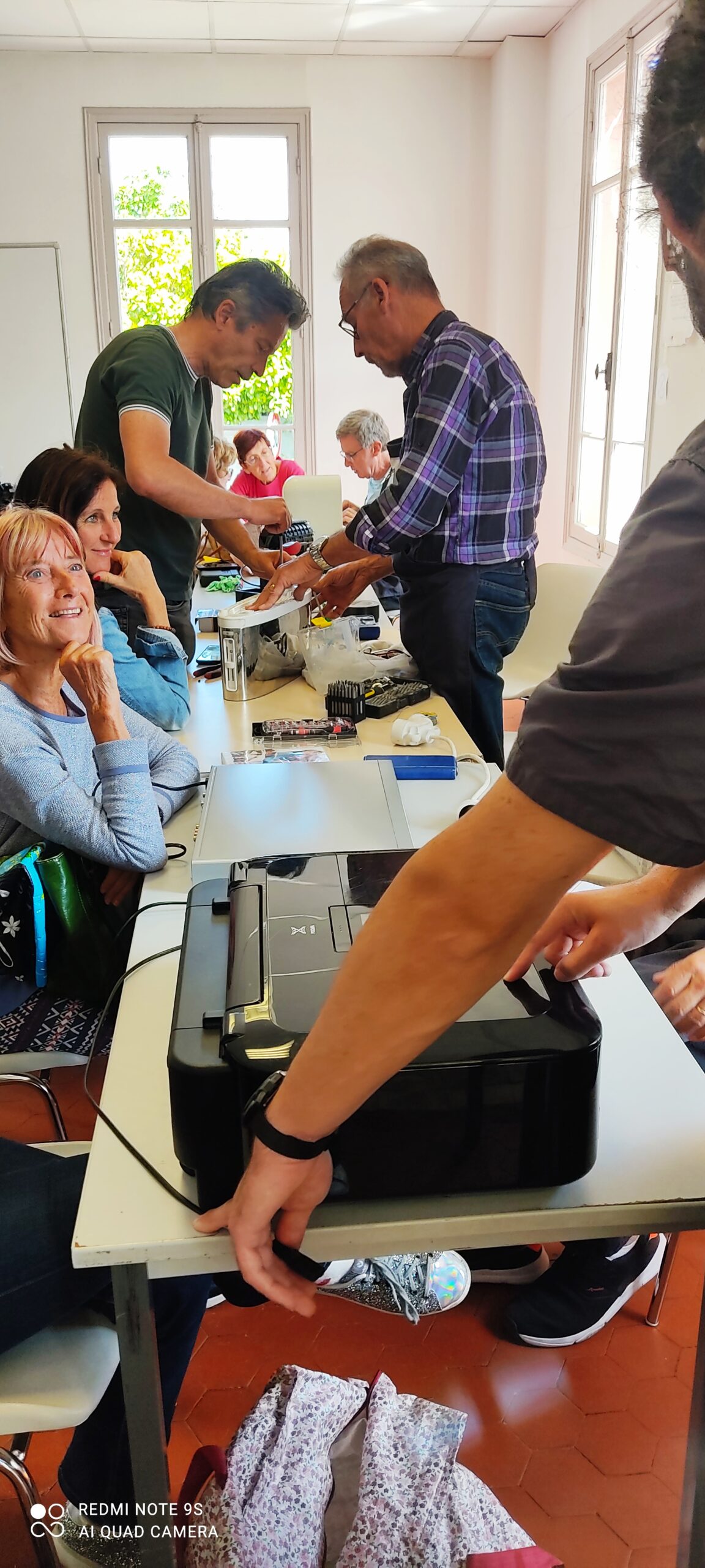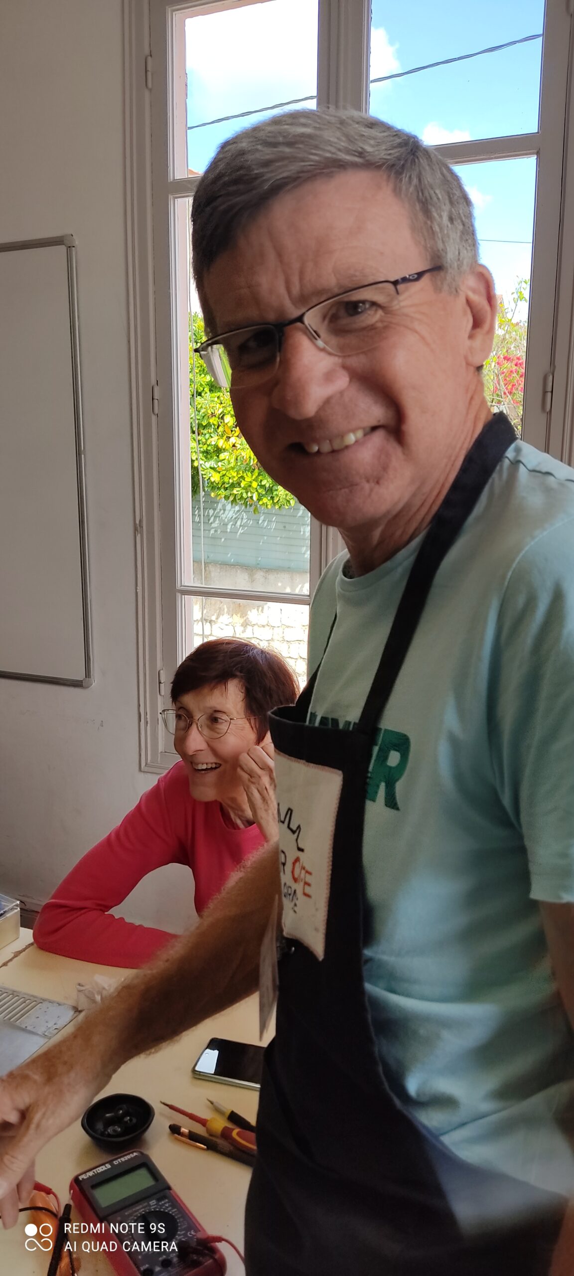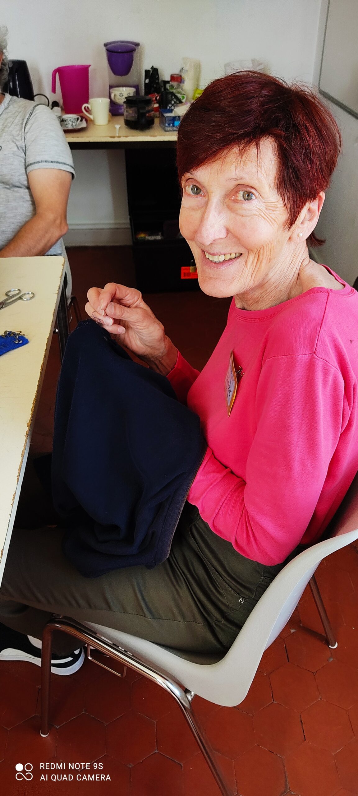 Notre souriante Claude se charge ici de réparer les accrocs d’un pantalon, quant à Pierre il est très content d’avoir tout réparé avec succès aujourd’hui