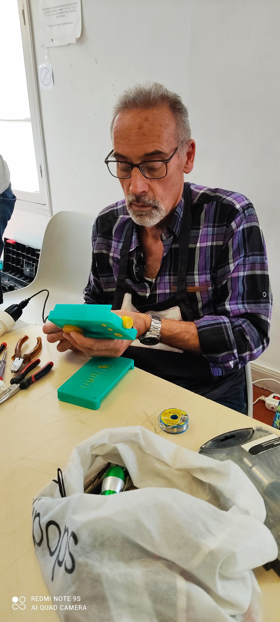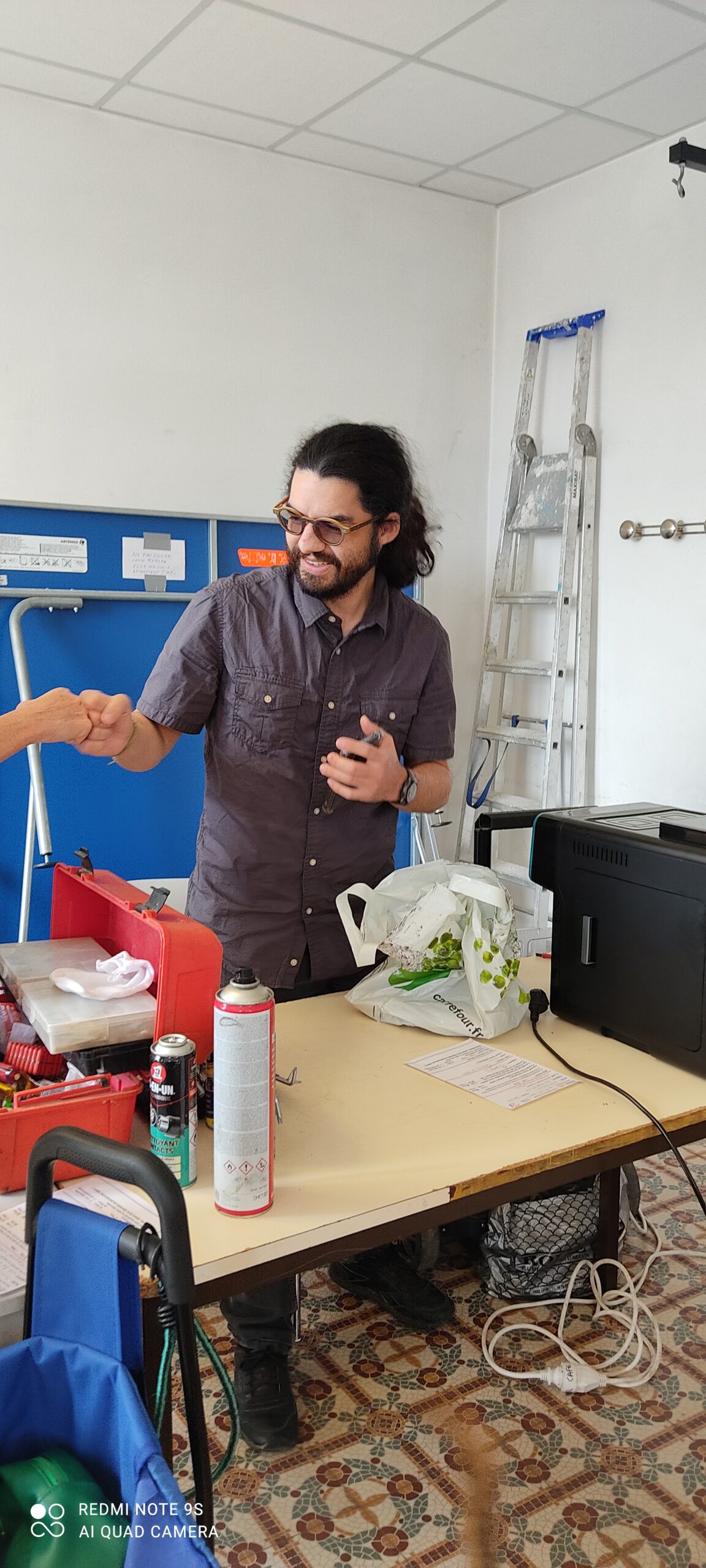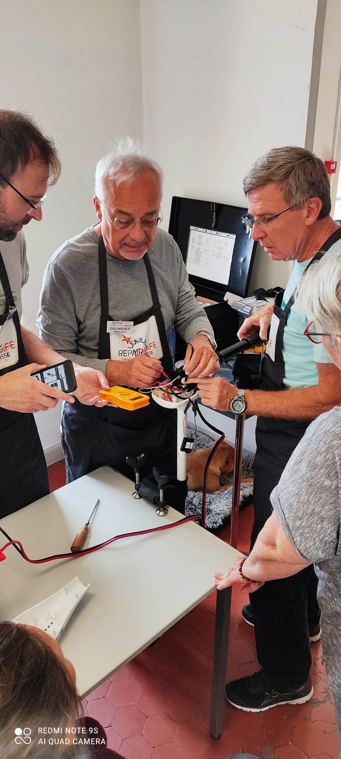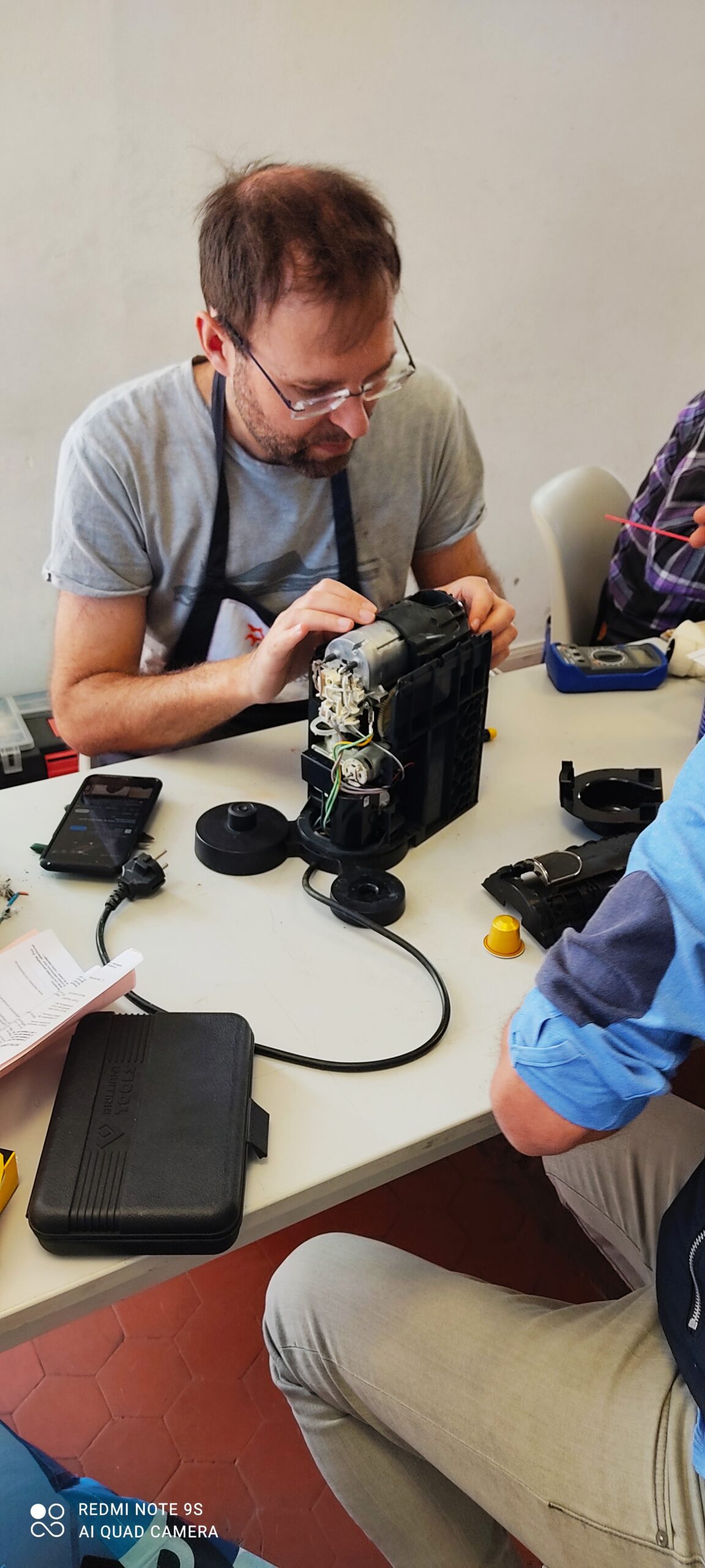 Réparation réussie et « check » pour Christophe (à gauche) et Marius (à droite) en pleine réflexion sur une cafetière capricieuse